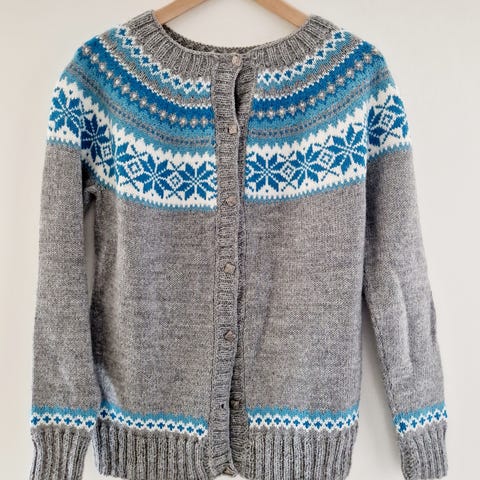 Jakke/kofte strikket av garnet Peer gynt. Utstillingsmodell kjøpt hos en lokal strikkebutikk for mange år siden. Kun brukt ett par ganger. Vet ikke hva mønsteret heter. Oppbevart tørt i klesskap. Røykfritt hjem.