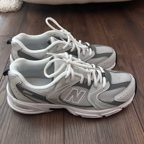 New Balance sneakers i størrelse 36. Joggesko i hovedsak hvit med mørke detaljer. Modellen har snøring foran, polstret hælparti og yttersåle med godt mønster. Egnet til hverdagsbruk og lett trening.