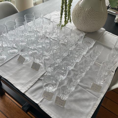 vinglass og champagneglass i klart glass. Settet består av ulike typer stettglass, blant annet glass egnet til vin og musserende drikke. Glassene har ulike mønstre og fasonger, med både rette og buede former i klarglass. Passer til servering av vin, champagne, musserende og andre kalde drikker ved borddekking til hverdag og selskap. Antall og eksakte størrelser fremgår ikke av opplysningene og bør avklares ved interesse.