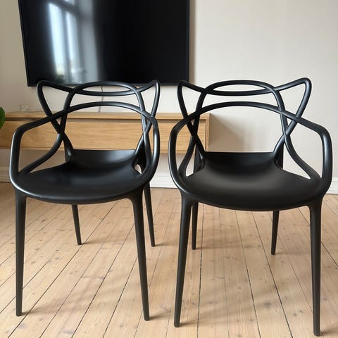 Kartell Masters barstol designet av Philippe Starck. Barstol med høy sittehøyde, heltrukket sete og integrerte armlener. Utførelse i svart plast med karakteristisk rygg med overlappende linjer. Egnet til bruk ved kjøkkenøy eller barløsning innendørs. Sittehøyden er 79 cm på disse stolene. Selges kr 1800,- pr stk. grunnet flytting.