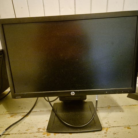 Skjermen har en størrelse på 54.6 tommer, egnet for bruk på kontor eller møterom. Bakpanelet viser tilkoblingsmuligheter som blant annet HDMI. Strømforsyning og teknisk informasjon er angitt på etiketten bak.