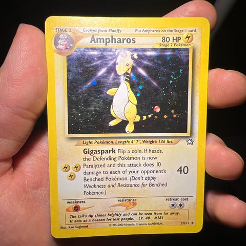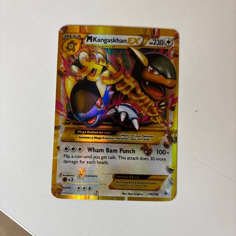 Pokémon M Ampharos EX samlekort. Holografisk kort med illustrasjon av M Ampharos på forsiden og standard Pokémon-bakside. Kortet tilhører Pokémon Trading Card Game-serien og har angrepet Exavolt samt tilhørende kortinformasjon trykket på forsiden. Egnet som samlekort eller til bruk i Pokémon-kortspill. Kan sendes med brev.