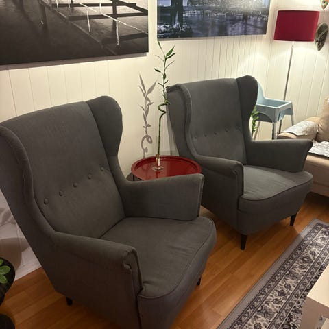 Selger 2 stk. pene og komfortable reclinere i grått stoff. Stolen har høy rygg og god sittekomfort, og kan legges bakover for ekstra avslapning.