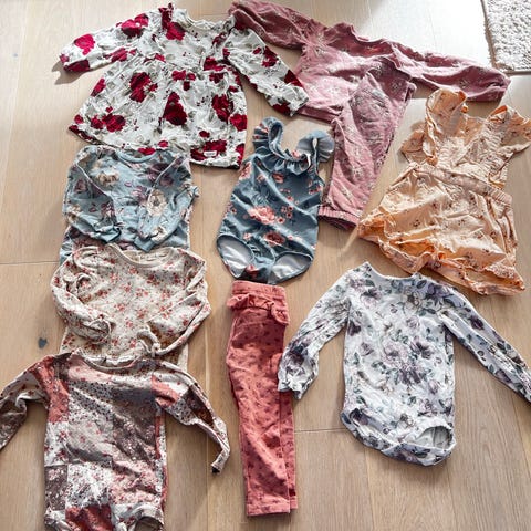 H&M og newbie jente klær i størrelse 86 i ulike rosatoner. Pakken inneholder et utvalg plagg for små jenter, blant annet bodyer, topper, kjoler, bukser og badedrakter. Fargene går hovedsakelig i rosa og lyse nyanser, med noen mønstrede plagg. Klærne passer til hverdagsbruk og kan kombineres på flere måter. Alle plaggene er i størrelse 86 og er tilpasset jente. 2 stk badedrakt. Den ene er ubrukt. Kan være noe slitasje på knea på bena og noen flekker.