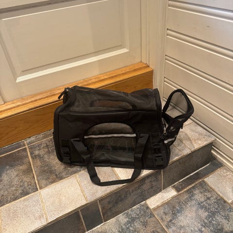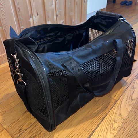 Sherpa Sherpa Pet Carrier medium transportbag til kjæledyr i svart stoff. Bagen har nettingpaneler på flere sider for god lufting og innsyn, samt glidelåsåpning i front og på toppen. Innvendig ligger en avtagbar, polstret matte for økt komfort. Bagen har bærehåndtak og skulderstropp for enkel bæring. Egnet for transport av mindre kjæledyr, for eksempel katt eller liten hund, og kan brukes til reiser, veterinærbesøk og annen kortere transport.