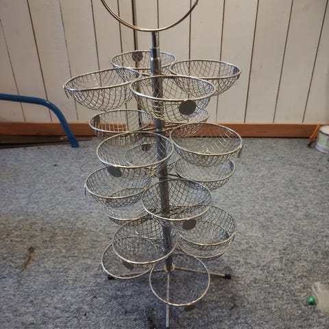 IKEA metallstativ med kurver i hvit farge. Stativet har flere runde trådkurver plassert i høyden på en sentral stang med rund fot. Egnet til oppbevaring av for eksempel frukt, grønnsaker, tilbehør eller småting i kjøkken, bod eller andre rom. Laget i metall med åpen trådkonstruksjon som gir god oversikt over innholdet.