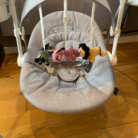Pent brukt vippestol/babysitter. Bebis kan ligge flat eller sitte opp. Avtagbar leke følger med, den kan lett brukes på vogn, bilstol og lignende.