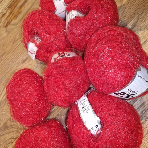 8 nøster med rød Iceyarn glossy akryl garn med litt glitter effekt