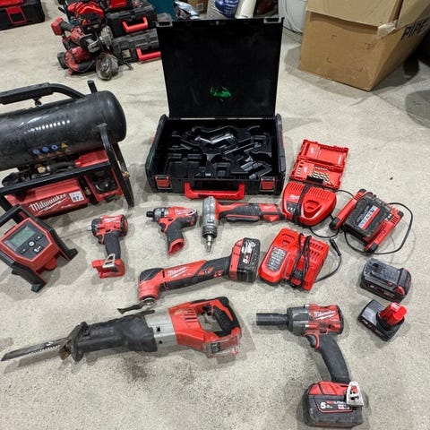 Omfattende verktøysamling med både batteri- og nettdrevne maskiner, håndverktøy og tilbehør. Inneholder blant annet Milwaukee maskiner, Makita borhammer og muttertrekker, Würth borhammere, Echo ryggblåser samt pipesett og diverse håndverktøy.🔹 Milwaukee M18 borhammer