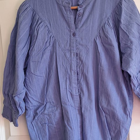 Xirena bluse for dame i størrelse M. Blusen er beige/okerfarget og laget i bomull. Modellen har v-hals og korte ermer med rynkedetaljer. Stoffet har en lett, strukturert overflate. Passer til hverdagsbruk og kan kombineres med både bukser og skjørt.