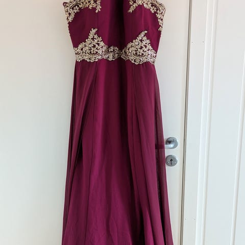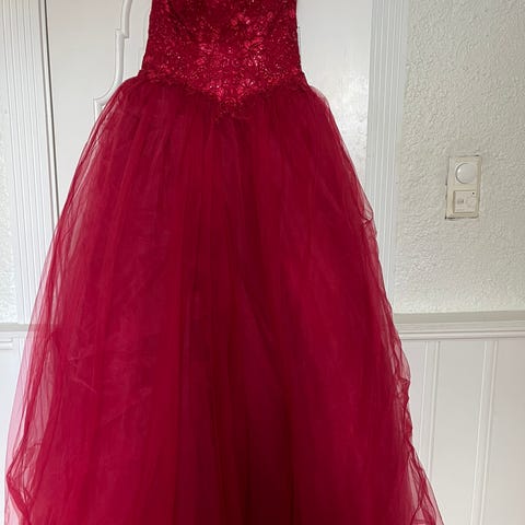 Vi selger en nydelig rød Alexandra Ritzi ballkjole i størrelse 38. Kjolen er kun brukt en gang på ball 💃🏻 og selges med underskjørt m tre ringer (også kjøpt på Alexandra Ritzi). Både ballkjolen og underskjørtet fremstår som nytt.
