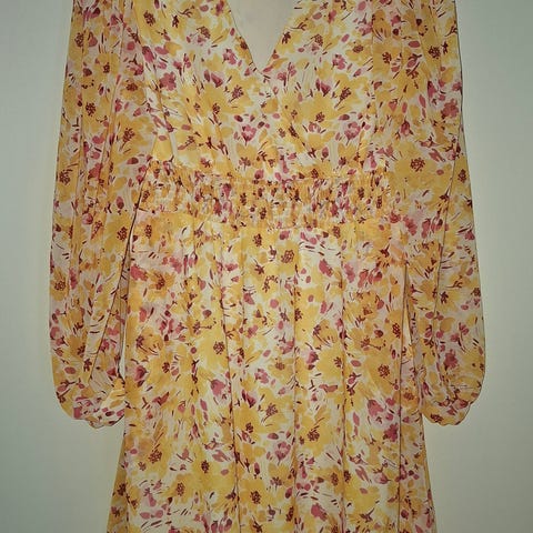 Careless sommerkjole i chiffon for dame i størrelse M. Kjolen er lilla med blomstrete mønster og har lange ermer. Overdelen har omslagssnitt og markert midje med strikk, som gir en lett innsvinget fasong. Stoffet er lett og luftig, egnet for bruk i varme årstider eller innendørs hele året.