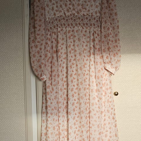 Brukt en gang. Careless sommerkjole i chiffon for dame i størrelse M. Kjolen er beige med blomstermønster og har lange ermer. Lett og luftig materiale som egner seg godt til bruk på varme dager eller til hverdagsbruk i sommerhalvåret.