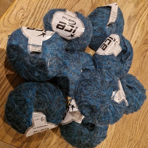 Selger 350gr med Iceyarn blått mohair blandings ull garn, 50g = 250 m. Innhold mohair ull og akryl Veldig fint garn til strikkeplagg Mrk 56826