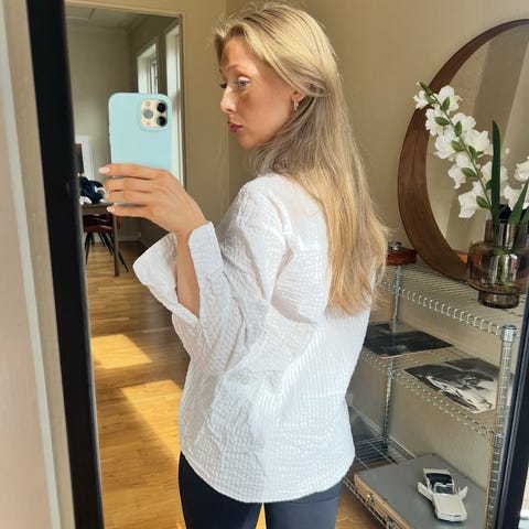 Flott vårlig skjorte fra danske Mos Mosh som dessverre er litt stor til meg og derfor kun har blitt brukt en gang. Passer til både skjørt, bukse og shorts. Modellen heter Lina Frill og fargen er beige/off white, men den har litt rosatone i beige fargen. Er veldig fin.