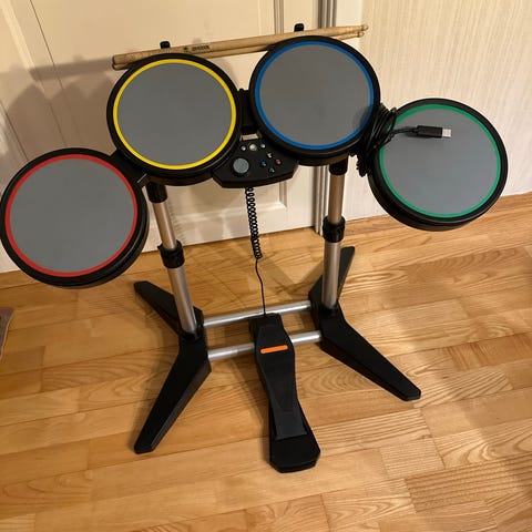 Trommesett som kan brukes til både rock band/guitar hero på xbox 360. Mangler trommestikker, men det kan man nok lett få tak i. Funker som den skal ellers.
