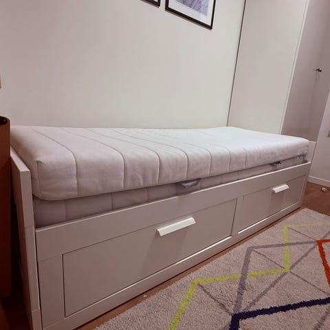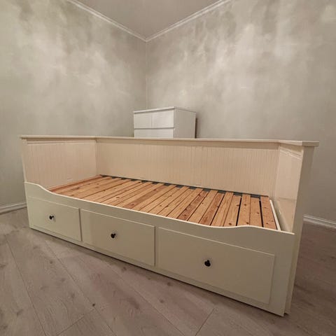 IKEA dagseng med oppbevaringsskuffer i grå utførelse. Sengen har rygg- og sidepaneler med profilert treverk, og fungerer både som sofa på dagtid og seng om natten. Under sengen er det flere romslige skuffer som gir ekstra oppbevaringsplass. Passer til standard enkel madrassstørrelse. Egnet til bruk på soverom, barnerom eller gjesterom.