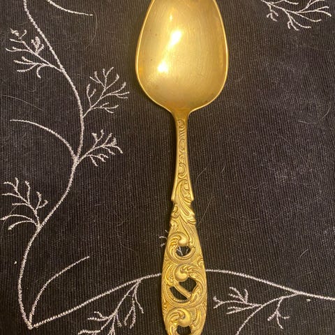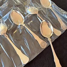 12 "Dronning" spiseskjeer fra Tostrup selges for 900 kr stykket. Lengde 20 cm. I god stand, men trenger en liten puss. Tre av skjeene har monogram og data inngravert på baksiden. Etuiet følger ikke med.