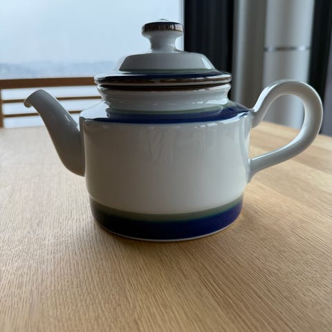 Tekanne fra Dan-Ild-serien produsert av Lyngby Porcelæn i Danmark, designet av Axel Brüel i 1958. Klassisk dansk mid-century design i dyp koboltblå glasur med hvitt lokk.