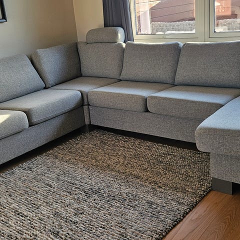 Selger en hel og pen hjørnesofa fra IKEA. Nylig renset, men har stått i hjem med hund. For mål se bilde.