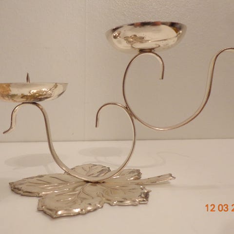 dekorativt blomstermotiv. Lysestaken har en rund lysskål med pigg til å feste lyset, og en blomsterformet dekorasjon over lyset. Utførelsen er i metall med detaljer i gyllent og sølvfarget metall. Egnet for bruk med kubbelys eller stagelys, og kan henges på vegg som både lys- og dekorelement i for eksempel stue, gang eller soverom.