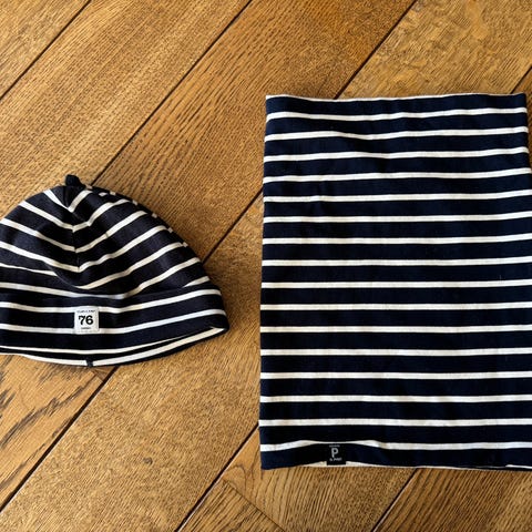 Klassisk PoP bomullslue, fôret med myk fleece, samt fingerhansker; pent brukt av ett barn; ingen skader/ merker/ hull.