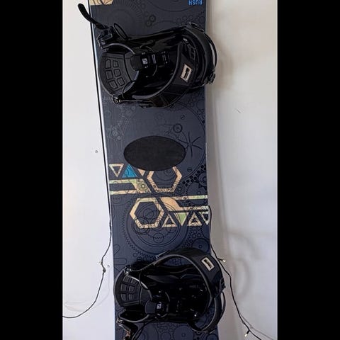 Crazy creek snowboard med bindinger i svart og blått. Bindingene er justerbare med tå- og ankelstropper og spenner. Passer til allround kjøring i bakke. Lengde 128cm.