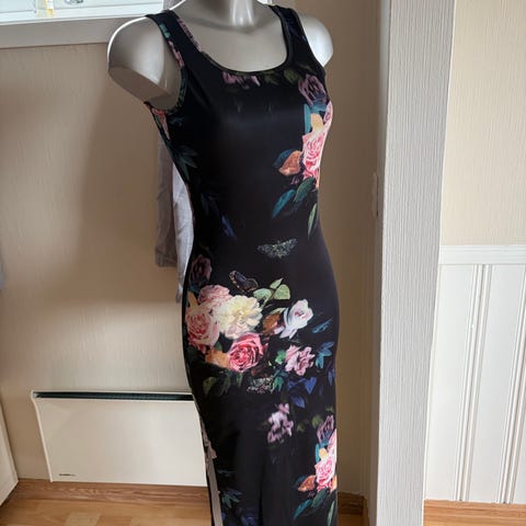 Kjole 3: Lite brukt stroppe kjole. Vet ikke hvor den er fra. Rosa/lilla grunnfarge med mørkelilla blomster. (Kan reguleres i stroppene)