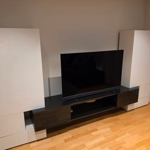 Praktisk med helt lukket, men fjernkontroll går gjennom, for et stoff i skapdør under.