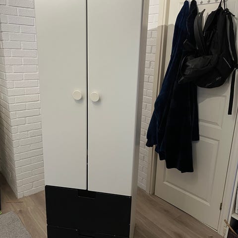 Fin liten kommode av typen IKEA Stuva. Fagene svart og hvit med 3 skuffer og 2 hyller.