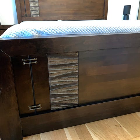 Bohus sengegavl med integrerte nattbord og polstret ryggstøtte. Sengegavlen er i mørkt treverk med to faste nattbordshyller. Ryggstøtten har lys, tekstiltrukket pute med ekstra nakkepute for støtte. Passer som hodegavl bak seng i soverom. Passer til 180 seng