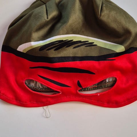 H&M kostyme i form av grønn heldrakt for barn, unisex, i størrelse 122/128. Drakten har lange ermer og lange ben, samt påtrykt belte- og ninjamotiv i kontrastfarger. Hetten er fastsydd og har sorte og gullfargede detaljer. Plagget er laget i et elastisk materiale som gir god bevegelsesfrihet, egnet som utkledningsdrakt eller karnevalskostyme.