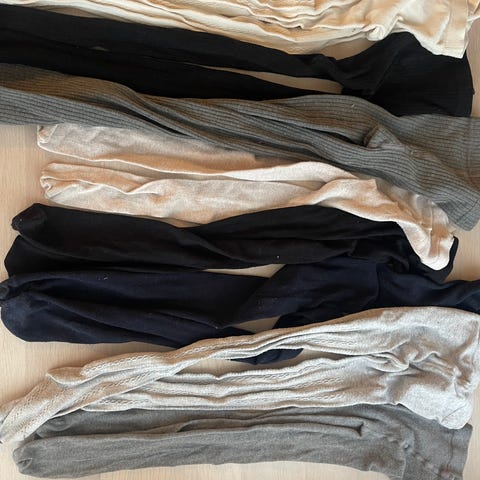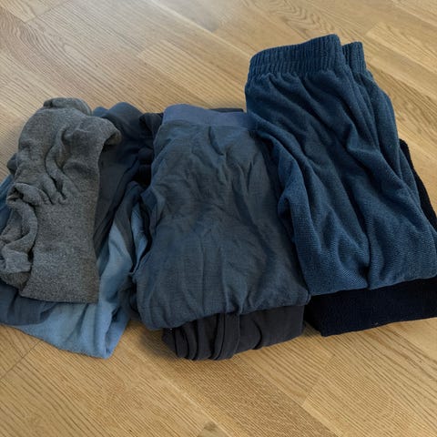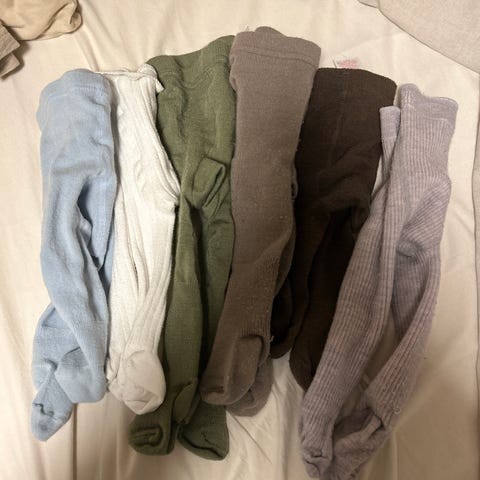 Tights fra Newbie (mint grønn), Crew (lilla), Next (svart) Lindex (svart med rusj på knærene) 1 svart bukse med lett sleng fra Cubus.