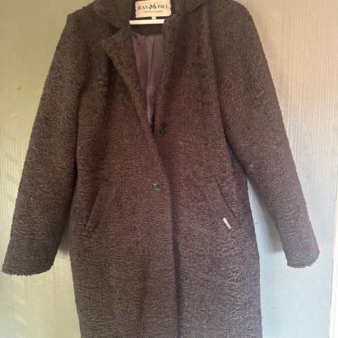 Jean Paul kåpe i ull for dame i størrelse M. Kåpen er brun med rutete mønster og har klassisk krage og knepping foran. Ytterstoffet er i ullblanding, med glatt fôr på innsiden for økt komfort. Lengden er under kneet, og modellen har lange ermer. Passer som yttertøy i overgangssesonger og mildere vinterdager.