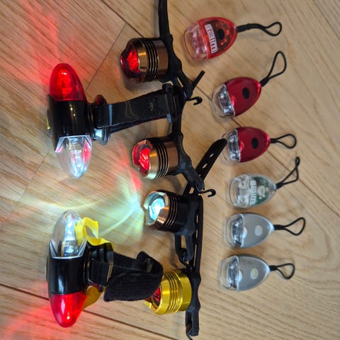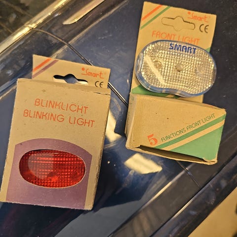 2 stykk framlykt til sykkel og 1 stykk hengelås til sykkel selges samlet. Ubrukt og i orginalembalasje.