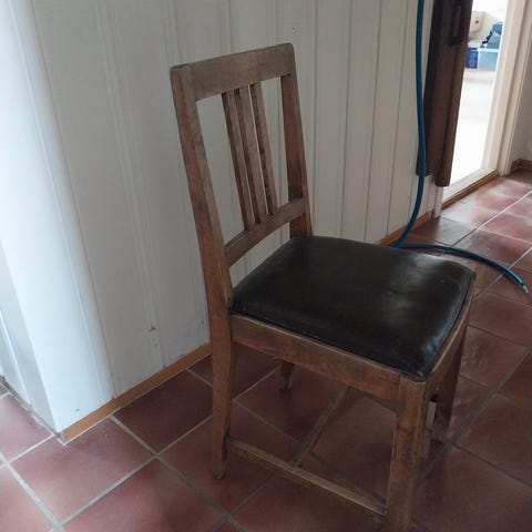 Stolene er stabile og fine i treverket. Sete og rygg er trukket i blått stoff i dag, men dette er en modell som er svært enkel å trekke om – rette flater og god tilgjengelighet gjør prosjektet overkommelig også for deg som ikke er proff.