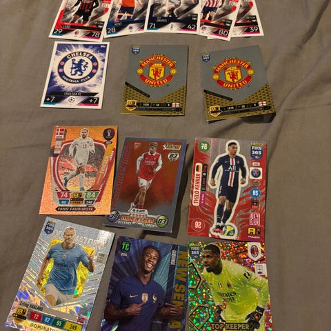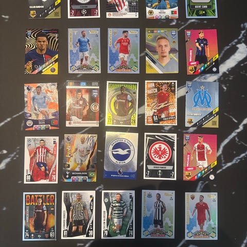 Her er match attax 24/25, premier leauge 25/26 og match attax 25/26. det er og parallell kort. Forskjellige kort, men få av Arsenal siden det er det eg samler på selv;)