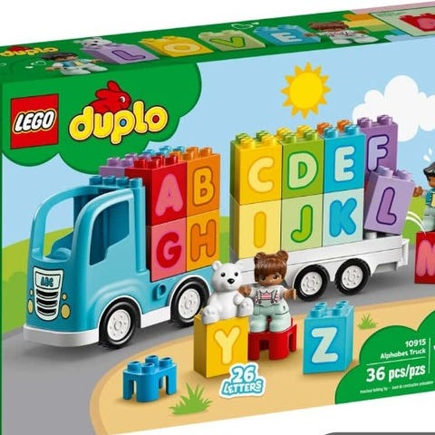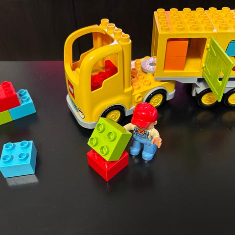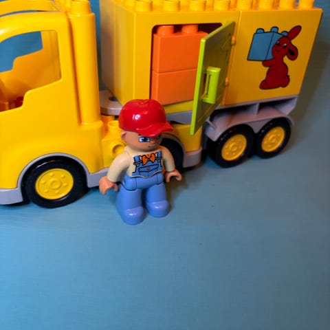 LEGO DUPLO lekesett med lastebil, førerfigur og fargerike klosser. Settet består av en gul lastebil med tilhenger som kan åpnes, en LEGO DUPLO-figur og flere store byggeklosser i ulike farger. Delene er store og enkle å håndtere for små barn, og passer til fri lek, enkel bygging og kombinasjon med andre LEGO DUPLO-sett.