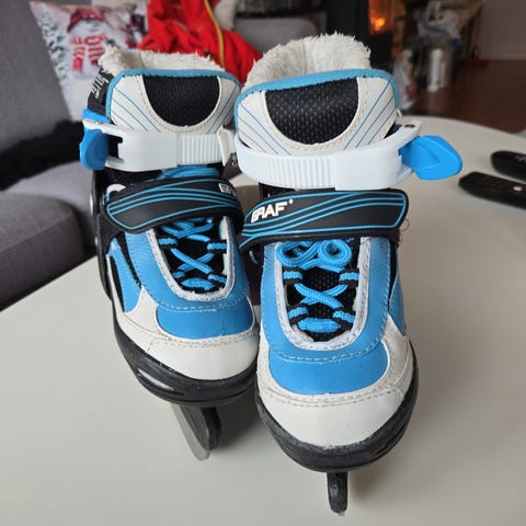 Graf justerbare ishockeyskøyter for barn i størrelse 30-33. Skøytene har hard yttersko i plast med svart og hvit farge, samt innvendig polstret og pustende mesh-materiale for bedre komfort. Lukkes med justerbare spenner over vrist og ankel for stabilitet. Egnet til ishockey og generell skøytebruk for barn .