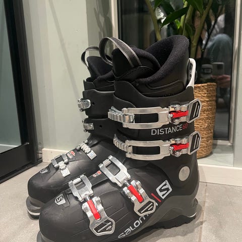 Salomon alpinstøvler i størrelse 25,5 med sålelengde 296 mm. Lesten er merket 104 mm. Støvlene er svarte med metallspenner og røde detaljer. Egner seg til vanlig alpint bruk i alpinanlegg.