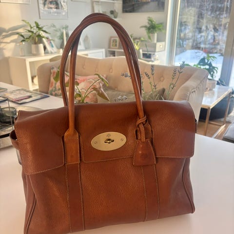 Størrelsen er etter min mening perfekt, den kan blant annet romme 13-tommers Mac. Den har blitt behandlet svært forsiktig og har gjennom årene blitt satt inn med lærmidler som anbefalt i Mulberrybutikken.