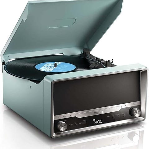 Denver platespiller/CD spiller med innebygde høyttalere i kompakt bordmodell. Enheten har toppmatet platespiller og frontpanel med display, knapper og dreiehjul for betjening. Kabinettet er i mørk utførelse med tekstilfront foran høyttalerne. Passer til avspilling av vinylplater i hjemmemiljø, for eksempel i stue eller soverom.