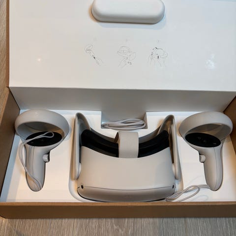 Meta Quest 2 VR-headset med to håndkontrollere i hvit farge. Standalone VR-brille med justerbare stropper og polstret ansiktspute for komfort. Er veldig lite brukt, fikk til jul. Mistet lader, men lader helt fint med vanelig usbc lader😁