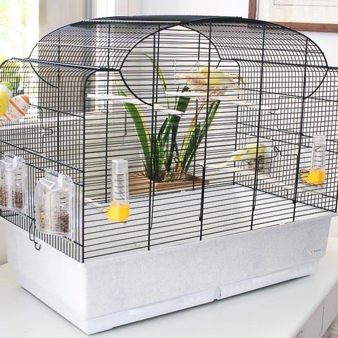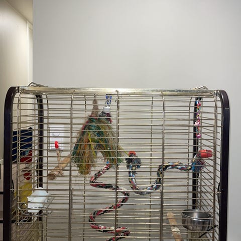 Buret er romslig og passer godt for papegøyer eller andre fugler som trenger god plass. Det har hjul slik at det er lett å flytte.