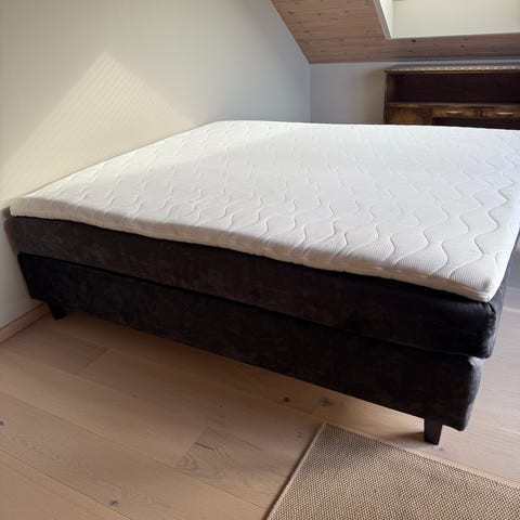 Jysk kontinentalseng mørk grå, overmadrass ny.