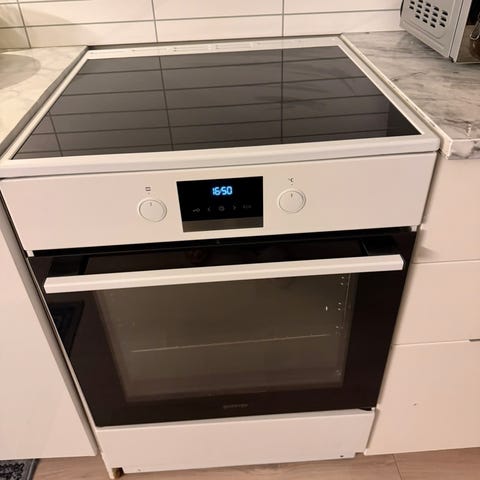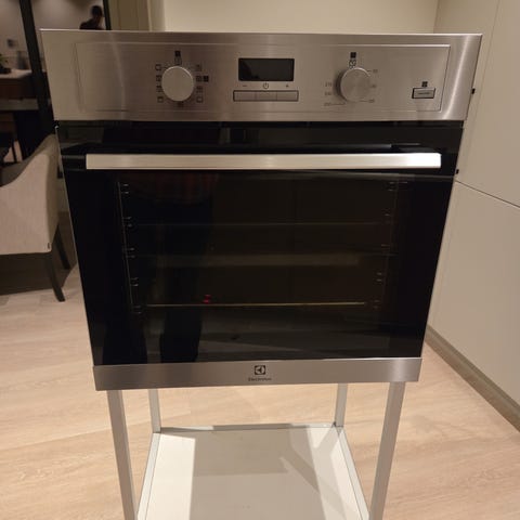 Gorenje stekeovn innbyggingsovn i rustfritt stål med sort front. Tre trinn pyrolyse. Ovnen har vifte i bakvegg for varmluftsfunksjon og flere riller for plassering av stekebrett og rister. Alt er komplett. Fronten har display og to betjeningsknapper for valg av funksjoner og temperatur. Egnet som innbyggingsovn på kjøkken, krever fast tilkobling i kjøkkeninnredning etter gjeldende forskrifter. Må skifte to lyspærer inni ovnen. Bud over 500,-