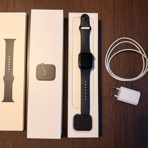 Apple Watch Series 5 smartklokke med 40 mm urkasse i space gray aluminium. Klokken leveres med svart sportsreim og original eske. I esken følger det med kun ladekabel . Modellen har rektangulær skjerm, digital krone på siden og optiske sensorer på baksiden for måling av aktivitet og puls. Egnet for bruk til varslinger fra iPhone, aktivitetsregistrering, tidtaking og daglig bruk.