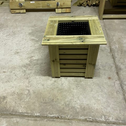 Blomsterkasse i impregnert tre med stående spiler holder i mange årMål utvendig 71cmx64cmx33cm Mål innvendig 48cmx40cmx42cm.Ved kjøp av 2stk 1000kr i rabatt.Kan levere mot ett lite tillegg