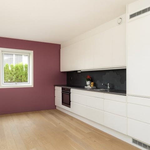 Reservert. - Kjøkkeninnredning i hjørneløsning med hvite fronter og trebenkeplate. Overskap med heldekkende dører og vitrineskap med glassdører og glasshyller. Underskap med skuffer og skapdører, samt høyskap for ekstra oppbevaring. Benkeplate i heltre med synlig åremønster. Kjøkkenet har integrert belysning under overskap. Passer til montering i hjørne med både overskap, underskap og høyskap for oppbevaring og arbeidsflate på kjøkkenet.