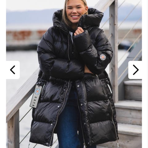 Holzweiler dun vinterjakke for dame i størrelse XS i svart farge. Jakken er fylt med dun for god isolasjon og varme. Den har høy krage og hette som gir ekstra beskyttelse mot vær og vind. Yttermaterialet er glatt og quiltet med brede paneler. Jakken har frontlukking, sannsynligvis med glidelås og klaff, samt lommer i front. Passer som ytterjakke på kalde vinterdager.